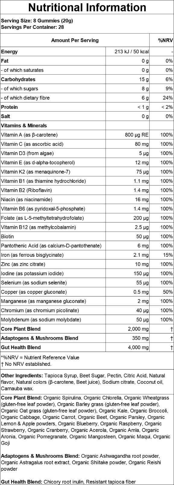 Vitamine A (uit bèta-caroteen), vitamine C (ascorbinezuur), vitamine D3 (uit algen), vitamine E (d-alfa-tocoferol), vitamine K2 (menaquinon-7), vitamine B1 (thiaminehydrochloride), vitamine B2 (riboflavine), niacine (niacinamide), vitamine B6 (pyridoxaal-5-fosfaat), folaat (L-5-methyltetrahydrofolaat), vitamine B12 (methylcobalamine), biotine, pantotheenzuur (calcium-D-pantothenaat), ijzer (ferrobisglycinaat), zink (zinkcitraat), jodium (kaliumjodide), selenium (natriumseleniet), koper (kopergluconaat), mangaan (mangaangluconaat), chroom (chroompicolinaat), molybdeen (natriummolybdaat).